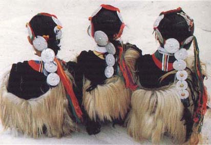 纳西人较早的披肩上,在羊皮颈的上部左右对称各缀着一个直径约五寸的圆盘,圆盘上用彩色丝线绣有各种图案。在羊皮颈的下部,缀有七盘直径约三寸,仍绣有彩色图案的小圆盘饰物,每一小圆盘的中心各吊两面三刀条麂皮细线,共有十四条,称“优轭崩”,即羊皮须。