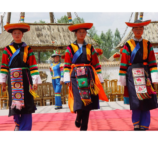 妇女戴额带,其形如倒写的“丁”字,用蓝布或黑布做成两指宽筒状后缝合,交叉处用白线挑成齿形花纹,称“狗牙花”。头戴卷边毡帽,足穿“过加”、“花云子鞋”、“腰鞋”。“过加”,又称“其吉都鞋”、“仄子花都鞋”,鞋面上用彩色丝线绣成各种花卉及打仄子花,鞋尖饰彩色短穗,鞋后跟接三指大小的红布溜跟即成。“花云子鞋”,以鞋面上用彩色丝线绣制云纹状盘线图案,故名。“腰鞋”,又称“斯果尔玛鞋”、“怏子都鞋”,因其形似长筒靴,故名。老年妇女服饰以深色,黑色为主,一般头戴黑色卷边圆顶绒毡帽,身着小领斜襟长袍,上套黑色坎肩,不穿七彩花袖衫,不系绣花腰带。