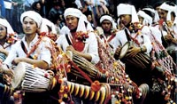 景颇族人的节日盛装就大不一样了,特别是姑娘们的装束更为精美艳丽。她们的上衣是黑色平绒缝制的紧身衫,前胸和后背镶嵌着3圈闪闪发光的银泡,从银泡上向下挂着一串串银链和银饰物,有的姑娘胸前和后背还镶嵌着2排银牌。这一套装扮,真好像古代女侠,走起路来哗啦啦响,更衬托出她们的矫健美丽。姑娘们说,那些银泡和银链装饰在身上,就好像那吉祥的孔雀。姑娘们的下身着红色的毛织统裙,上面还有她们巧手绣出的美丽的花纹。有的姑娘头上还戴着高高的红色的毛织包头,有的姑娘烫了发,头发披散在肩上,个个都显得很精神、很秀美。