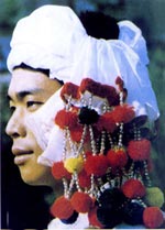 景颇族的小伙子的民族服装也很漂亮,特别是他们的头上裹着洁白的包头,在包头布的一端装饰着红色的绣球,挂在耳边格外的醒目。每个小伙子都佩戴着两件引人注目的东西:一只装饰着小银泡、小银链的挎包和一把挂在腰间的长刀。一般景颇族小伙子都有两把长刀,一把是平时劳动用的,一把是在喜庆节日时作为装饰的礼刀。礼刀很贵重,银制的刀把,刀鞘上面还刻着各种花纹。佩戴长刀可以显示景颇族人英勇顽强、刚毅不屈的性格,也是男性勇敢壮美的标志。