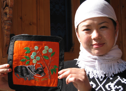 撒拉族女青年韩佩玲在展示她的刺绣作品
