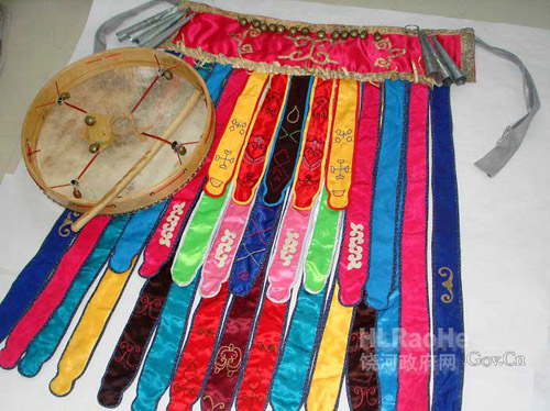 腰带是用来系挂铁腰铃的是用宽12—18cm的兽皮制成。它从后面和侧围住腰部,端部缝有小带子,以便在前面系在腰上。在腰带上缝有几排小短带,以便悬挂铁腰铃及小铜镜、小铃铛等。