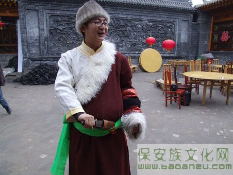 男子服饰方面:平素喜戴用白布或黑布做的圆顶小帽,俗称号帽;穿白衬衫,从右肩露出一只袖子,外套青布裌裌 (似坎肩),下身着蹬马靴。男子长袍似“藏袍”,但较“藏袍”稍短,还有不同宽度和不同色彩的“加边”,束腰带,系保安腰刀。腰带的长一般都是围腰三圈,再外露一尺许,约有五米长,老年人束青黑色,中年人束紫色,年轻人束红、绿色。冬季穿白茬羊皮袄或翻领皮袄,多为褐色面子。