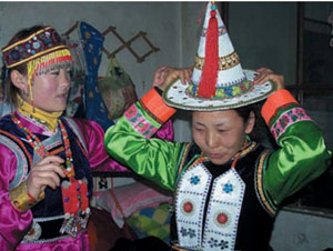 未婚少女和已婚妇女的帽子略有不同:未婚少女的前额戴“格尧则依捏”,即在一条长红布带上边缀以珊瑚珠,下边缘是用红、黄、白、绿、蓝五色的珊瑚和玉石小珠串成的许多穗,它象珠帘一样齐眉垂在前额。梳五条或七条发辫,辫梢内有彩色的丝绒线,系在背后的腰带里。盛装的妇女,戴宽沿圆筒平顶帽,帽顶上垂下大红彩络。已婚妇女戴长形的头面,即先将头发梳成三条辫子,一条垂在背后,左右辫由耳后垂在胸前。头面是三条,系在三条发辫上,每条又分三段,是用金属环子连接起来的,上面镶有银牌、珊瑚、玛瑙、彩珠、贝壳等饰品,构成美丽的图案。戴的头面要求上齐耳环,下至长袍底边,头面长短以身材高矮而定。