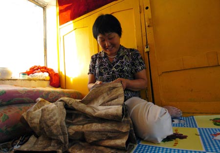 黑龙江省同江市街津口赫哲族乡的赫哲人尤文凤在制作特色鱼皮衣