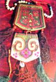 裕固族女子爱美,常常佩带项链、耳坠等饰物,并在衣服上挂有刺绣的香包、荷包、针扎等小挂件。这些挂件上多绣有花草、云纹、万字纹等图案和纹样。