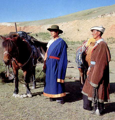 男子一般穿高领左大襟长袍,系紫红色或蓝色腰带,戴圆筒平顶锦缎镶边的白毡帽,穿高筒皮靴。