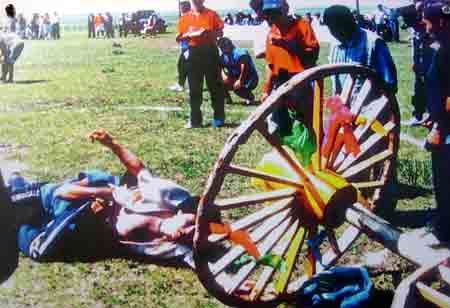 驮背,达斡尔语称为“特莫阿特贝”,即像骆驼一样驮物之意。参赛运动员要将衣袖、裤腿挽好或穿运动衣以防绊腿,然后平卧在平地上。自选或由裁判员指定两名体重大致相同的年轻人,腿部以下相对横压在参赛者腰部,同参赛者组成十字形,随着裁判员的下令,参赛者靠四肢和腰部的力量,将背上的两人驮起。然后腿部立直,身体向前平伸,停立两三分钟为胜,如果驮不起或背上的人倒地为失败。
