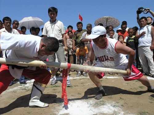 “拉杠”,也是传统的竞技项目,是力的较量,不论男女均可参加,多在渔猎的网滩、猎场休憩时或吉庆的日子举行。比赛时二人一平地顶脚对坐,二人双手横拉木棍,一方将另一方拉起即判获胜。