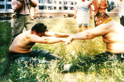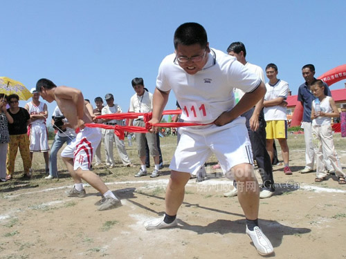 鱼王角力:比赛二人背向站立,将一条约五米长的绸布两头结牢后套于腹部用力拉拽,触及前方标志线或标志物者为胜。