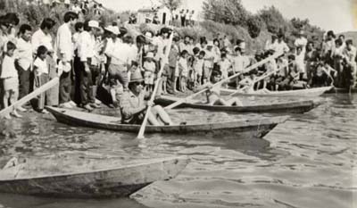 用一根七、八尺长两头扁面的划子(浆),坐在船上或站在船上双手左右拨动,也有用两只短划子坐着划,比赛时逆水顺水均可。划船比赛主要是在去捕鱼的途中进行,有时插上柳树条子或用面口袋或用麻袋绑棚(如帆)跑风,疾驶如飞,也有在船两边各安一个木轮子,双手摇轮前进。