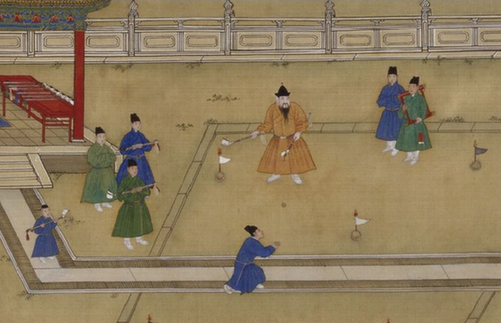 到了中唐,宫女们又更新花样,她们在草地上挖了几个「窟洞」,分成两队比赛。捶丸的形制到宋代发展完备,运动之盛更空前绝后。风气及于元、明两朝,元人杂剧《庆赏端阳》中就有道白:「你敢和我捶丸射柳,比试武艺么?」想来,说话者捶丸功夫了得,可惜看不出他的具体成绩如何,差「标准杆」几杆?