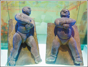 砖雕作品,展现了我国古代相扑运动员的风采。南北朝时,摔跤是当时比赛最多的一个项目。这时摔跤也称相扑、相辟、相攒,都是互相摔打的意思。据《太平御览》引王隐《晋书》说:在中原地区的襄城郡与颖川郡的联欢会上,就有相扑比赛。襄城人在输了之后反而解嘲地说:“相扑下技,不足以明两郡之优劣。”事实上体育比赛最能代表一个地区、一个国家和一个民族的尊严。为了维护这种尊严常常寸步不让,不争回荣誉,决不善罢甘休。《晋书·庾阐传》记载,在晋朝曾发生过这样的事情:“有西城健胡,矫健无敌,晋人莫敢与校”。司马炎为此事大为恼火。于是张贴榜文,“召募勇士”。后来,庾阐的父亲庾东应募,与胡人比赛。结果,“遂扑杀之”。庾东由此”名震殊俗”,并被赏赐做了官。