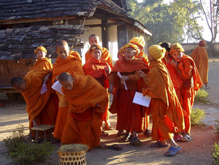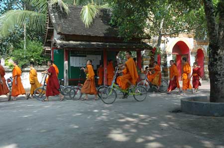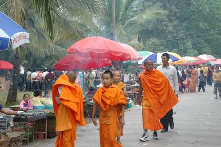 所以,直到今天,几乎在任何地方都能看到一袭黄色僧衣的小和尚,或走或坐在巨大的棕榈树下。虽然已经剃度为僧,但是孩童的天性并没有消泯,几个顽皮的小和尚在路边嬉戏,但是在面相上俨然可以看得出庄严的影子。