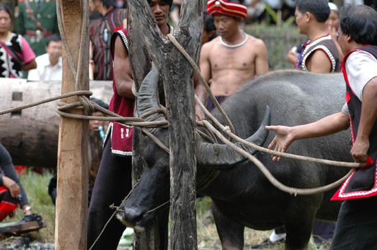 镖牛仪式既庄严又神秘。所用的水牛经过挑选,都是强壮的黑色公牛,一是佤族崇拜黑色,二是祭祀用的必须是水牛头。在他们看来,大角牛头是神圣之物,是财富地位的象征,是供奉神灵的祭品。拴牛仪式开始,低沉悲壮的牛角号奏响、大木鼓敲起。副镖手带领佤族男子将两头牛牵到牛桩前用绳子拴好,然后互相巧妙配合,抛绳哄牛,既要用绳子把牛蹄栓住,又要躲避它防止被牛踢伤。紧接着,主持人宣布“请头人向镖手授镖枪”,镖牛手在魔巴的带领下走向前,接受镖枪和敬酒,左手持镖枪,右手拿杯喝干敬酒,在魔巴带领下返回镖牛场,锣鼓歌舞队更加热烈地敲锣打鼓、载歌载舞。紧接着,主持人宣布“请头人向镖手授镖枪”,镖牛手在魔巴的带领下走向前,接受镖枪和敬酒,左手持镖枪,右手拿杯喝干敬酒,在魔巴带领下返回镖牛场,锣鼓歌舞队更加热烈地敲锣打鼓、载歌载舞。