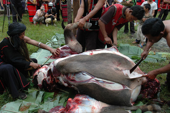 镖牛手手持长镖上前,对准牛的左肋间,猛力刺中牛的心脏,一举把牛镖死,众人齐声欢呼“猛!猛!猛!”魔巴上前确认牛镖得好不好,然后指挥男子把牛头取下,副镖手抬着牛头,主镖手跟随其后,到主席台前,向头人汇报镖牛情况。头人走下主席台检阅牛头,并以水酒向主镖手表示祝贺,大摩巴分别将鲜红的牛血涂抹在镖手身上,让带有神秘特性的牛血给其家人带来吉祥,全场锣鼓齐鸣、歌舞狂欢。同时,安排人员剖开牛腹,取出内脏,分割牛肉,参加活动的见者有份。随后,请观众抚摸牛头,可保平安健康、吉祥如意。