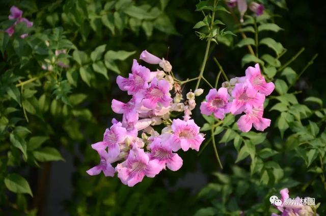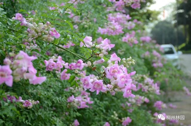异木棉花开绣粉黛,园林科技园里花如春,粉妆红裙的紫云藤,形似雪花的蓝花丹,微风拂至,纷纷起舞。