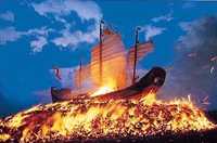“王船祭”中一般俗称流放王船为“游地河”;将船焚烧,让灰烬升天为“游天河”。