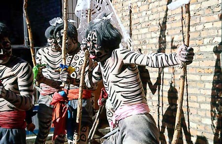 用灰涂身隐蔽起人的本相,以一种怪异凶猛的形象去驱魔除瘟疫,这符合古人的心理定式。高原的寒冬,室外气温多在零下十几、二十度,桑灰也能御寒。据说过去还要先用红辣椒面涂身,也是为了御寒。如今省去了这道“工序”,大概低温对跳於菟的小伙子来说已不是问题。原先化妆所用的颜料是锅底灰,现在也被墨汁所替代。村里两位化妆师给於菟化妆。纹饰有虎纹和豹纹两种。今年7名於菟中化妆成老虎的有4名,化妆成豹子的有3名。这里是著名的唐卡绘画之乡,可以说人人都是画师。给於菟化妆,很像人体彩绘。於菟的头发扎了起来,腰间用红布带缠束。腰刀插挂其间。用剪纸工艺做成的白纸幡挂在枝杆上。在过去还要准备洗净的羊肠子,吹满气后挂在於菟的脖子上,现在省去了。整个化妆用去两个半小时。