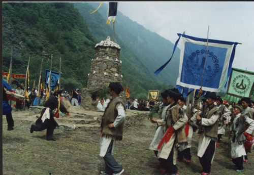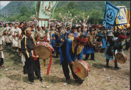 祭山会结束,释比念经送神。同时,组织众人抬着“白石神”,在释比率领下,遍游全寨,意为驱走寨中的污秽,迎接山寨的兴盛。此进,欢天喜地的羌人,手持五色三角小旗,尾随驱邪祈吉的队伍,吆喝着,跳跃着,鞭炮声,火炮声也此起彼伏,预示着来年牛羊兴旺,山寨昌盛。