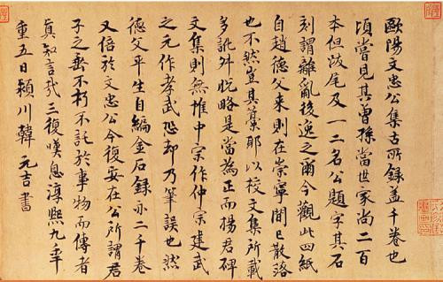 欧阳修喜以枯笔书写,虽露锋却不流浮,沉著有力,如苏轼所评:“尖笔乾墨作方阔字,神彩秀发,膏润无穷。”用笔精谨,线条爽利,给人以清新的感觉,故苏轼云:“笔势险劲,字体新丽,自成一家。”