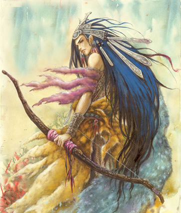 这时,有个年轻英俊的英雄叫做后羿,他是个神箭手,箭法超群,百发百中。他看到人们生活在苦难中,便决心帮助人们脱离苦海,射掉那多余的九个太阳。