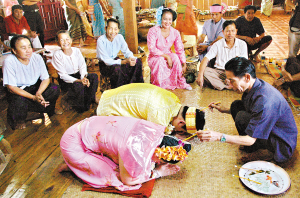 傣族结婚时,不仅要筹办婚宴,还要请歌手唱歌祝贺。参加婚宴的人,一般也要送点礼物或礼线,表示祝贺。