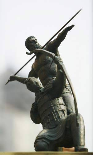 奥运雕塑中射箭的秦国士兵春秋时期还发明了弩,它又比弓先进了一步。一个是比弓射的远,二是命中率比弓高。到了战国时期弩已增加到四种。在《吴越春秋》中,详解了关于弩射之法,当时对弩射研究的深入程度反映了它的重要地位。