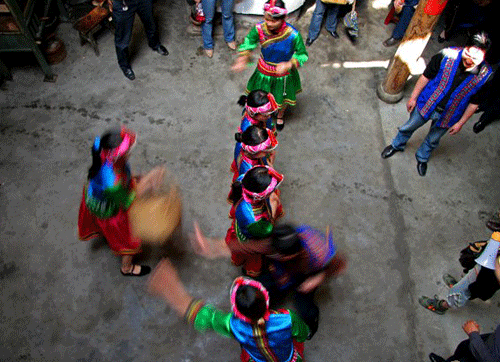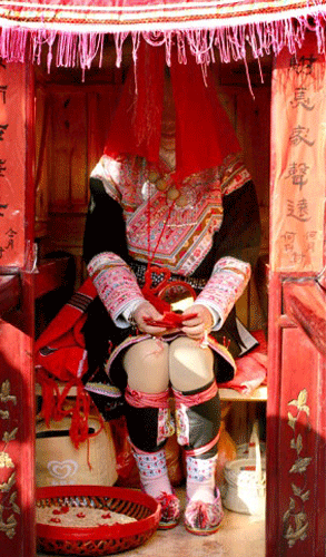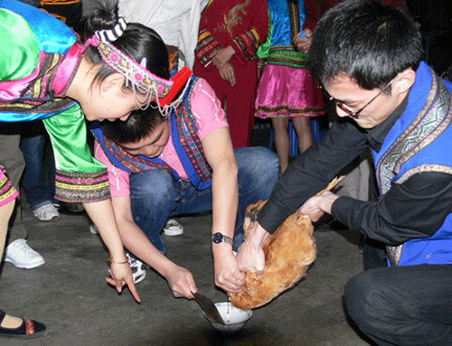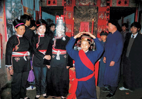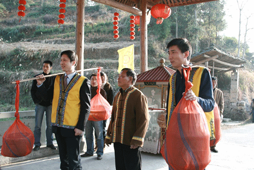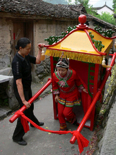 拜堂,首先要用茶、酒、五果摆香案,厅堂上高燃龙凤喜烛,“大姐”站在大厅上等候,当花轿进入男家大厅即放礼炮迎接。“大姐”与赤郎一一鞠躬,给赤郎双手拜上开轿门“红包”后,才进前开轿门。“大姐”伏身轿内,先取出桂圆放在轿前地上用脚踏碎,以破冲喜。而后再拿出“五谷种子”、“定身镜”,手袖红蛋安放茶盘内,牵引新娘下轿与新郎跪拜天地、祖宗、拜毕。新娘方入洞房。