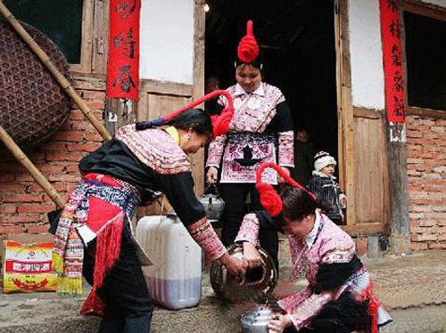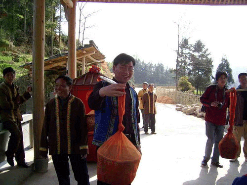 “送酒米”是由男家出钱,女家代酿酒的习俗。男家要送给女家“箩二”酒米(即十二斗糯米),由未婚新郎和媒人作伴挑送女家。由女家代酿红酒,作为宴请六亲九眷、抬轿赤郎的“婚嫁酒”。