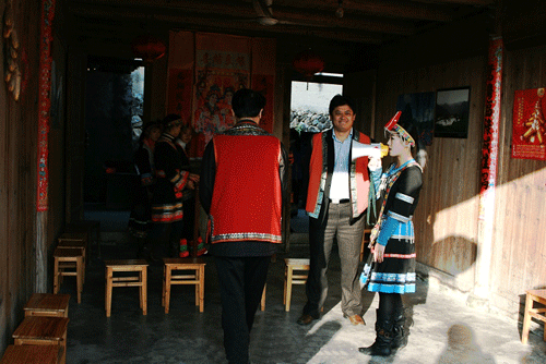男家选取两童男和两童女,分别手提铜锣二面,双喜灯笼一合,选放双响、连珠炮二人,持火把四人,到村外路口等候,用唢呐开路,迎接新娘。男家还备好米筛、尺、剪刀、镜、猪肉一条,悬挂中,以示避邪。用大红纸书写“凤凰到此”贴在中堂。新婚女进入男家大门时,公婆等亲属必须躲避,否则俗认为“犯冲”,日后家庭不睦。
