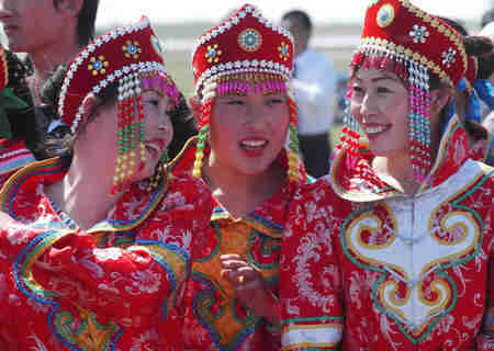 男方陪礼人先道:“贵方的少女我方的郎,千里姻缘系双方。选择这良辰吉日,我们将微薄的察恩特献上。山间的幼松稚柏,今已挺拔健壮,英俊美丽的少男少女,都已长大而且年貌相当。为祝贺两家美好的亲事,我把喜酒斟满举起,光临的众族胞和亲戚,请接受这虔诚的心意”。