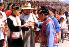 接着,新娘新郎举行喝酒仪式,每人面前放一碗酒,碗边抹上酥油,自己先喝一口,再喝交杯酒。新娘新郎喝完交杯酒,还共同招待介绍人和所有客人。然后双方客人以及来贺喜的亲戚朋友一起不断地饮酒唱歌和跳舞,直至通宵达旦。