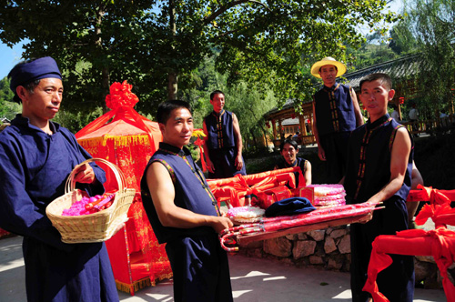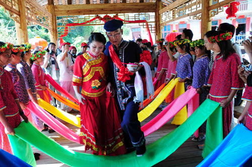 毛南族是我国人口较少的山地民族之一,以悠久的历史和独特的文化闻名于世。贵州毛南族主要居住在平塘县卡蒲毛南族乡。前不久首届黔南州旅游产业发展大会暨中国、平塘世界地质奇观旅游节期间,平塘县卡蒲毛南乡举办了毛南族婚典。来自北京、上海、成都、昆明、深圳等全国各地10对新人,在卡蒲毛南乡风情园内,以当地特有的方式举行了集体婚礼,喜结良缘,亲身体验了原汁原味的卡蒲毛南族婚俗。婚礼在挖掘毛南族婚俗特色的同时,又融入了新的时尚元素。观手识新娘、抢亲、接外婆、对歌、过火盆、过七彩桥、结发夫妻等精彩纷呈的婚典,给新人留下了深刻的印象。来自北京朝阳区的金贵激动地对记者说:这里的人民热情好客,民俗民风独具特色,自然山水风光迷人,在这样的环境和氛围举行婚礼,是自己一身中最难忘、最美好的永恒回忆。