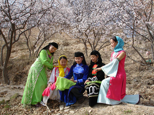 少女变成“艳姑”的必修课之一是刺绣。她们把绣枕头、绣袜底、绣鞋帮、绣围裙、绣荷包和绣兜肚当成农闲时的消遣。在男女结亲的日子里,新娘会将自己的绣品赠送新郎作为信物。近年来撒拉族的民间艺人将刺绣工厂开到了大城市,绣品在旅游市场上供不应求。