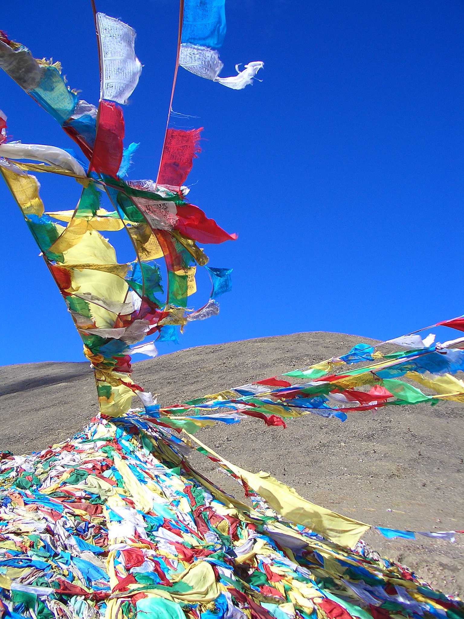 不知是否由于缺氧还是太冷,近来感觉全身关节酸痛。支队医生要我上午上班,下午休息。午后8点,薄暮初起,我靠着院门沿,遥望山顶飘扬的“龙达”——五彩经幡出神。此时节的江南,正值诗意的深秋:金风送爽,玉露侵肌,秋波清浅,醉山妩媚。