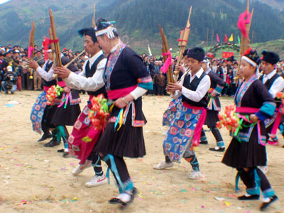 现在流传于靖西、德保县的“干各舞”,表演时由一人扮演干各鸟,穿上插氛有羽毛的服饰,一手操纵鸟的两个翅膀,使之上下舞动,犹如展翅飞翔,一手操纵鸟头,使之答答作响,示意向人们恭贺新禧。还有一人扮老头,在一旁挥舞马鞭伴唱,烘托节日气,祝愿人们吉祥如意。是以一雌一雄为表演队。雌者为凤,雄者为凰,均用竹子结扎而成,用宣纸装补裱,绘以五彩颜色,还加上羽毛装饰,形态似鸡,栩栩如生。凤凰舞由一男一女担当,女的舞凤,男的舞凰。凤凰平展的双翅,套于演员胯部,用彩带挂于演员肩上。凤凰的前面,也由一男一女手捧彩扇担任引凤凰角色,后面由两支唢呐及锣鼓,配以传统简单的乐曲伴奏,演员均穿上具有壮族特色的彩服,扎上头巾,以行进十字舞步为主,边舞边行,甚是好看。凤凰舞是壮族人民吉祥喜庆的象征,故当地壮族人民每逢喜庆佳节如春节、歌圩,婚嫁、丰收皆请凤凰舞之,以祷求吉祥。