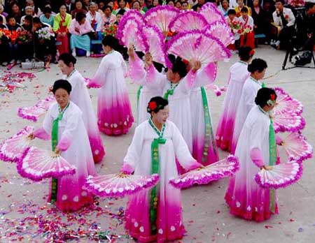 延边朝鲜族自治州的扇子舞是十九世纪末期,随朝鲜族的迁入而传入的,在流传过程中发生的一些变化。现在的扇子舞一般由女子表演,通过舞动扇子抒发内心的喜悦之情。动作舒展大方,舞动扇子与执扇造型有机地融为一体,在舒缓的节奏中给人以优美典雅的感受,在轻快的节奏中显得欢快活泼。扇子舞的动作主要有三种,即打开扇子、收扇子和晃动扇子,靠的都是手腕动作。虽然动作只有三种,但个中却有千变万化——演员们手中的扇子都是用来拟物的,因此表现力十分丰富。舞动扇子与执扇造型有机地融为一体,在舒缓的节奏中给人以优美典雅的感受。