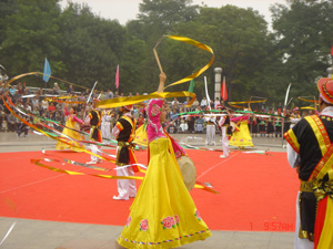 “象帽舞”是“农乐舞”中的最高表现形式,表现出整个“农乐舞”当中的最高技巧和最高兴奋点,并散发出浓郁的民族风趣,可以称其为整个农乐舞当中的华彩篇章。据传说:古代朝鲜族人民在耕作时,为了防止虎、狼等野兽的侵扰,用大象毛绑在帽尖上左右摇摆,用来驱赶野兽。久而久之,形成了朝鲜族特有的民族舞蹈表演形式。它种类繁多,具体分为:长象帽、短象帽、线象帽、羽象帽、尾巴象帽、火花象帽等。其中“线象帽”又称“十二脚象帽”。它是用长窗户纸纸条固定在象帽尖顶上的“轮”上,转圈摇头,作大圆型动作,结合杂技形式,能发挥和表现各种舞蹈技巧;“羽象帽”又称“毛象帽”,它具有丰富的感情色彩,是艺术含量较高的一种“象帽舞”表现形式,其作法是将十根白鹭羽毛捆在一起,扎在象帽尖顶上五彩缤纷的“连珠串”上,好像秋天里的一把灵芝草,表示喜庆和吉祥的之情;“尾巴象帽”是利用1—2尺长并较窄的窗户纸纸条,固定在象帽尖顶的“连珠串”上,然后左右摇头摆动,如同动物尾巴摇动,意在表现其自由自在的姿态。“火花象帽”是在“象帽带”尖上绑上几十个萤火虫,表演时仿佛萤火虫飞来飞去,显示出富丽堂皇的景象。