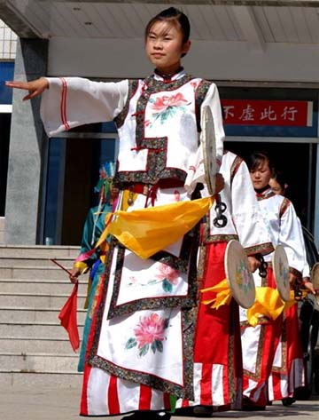 “单鼓”则与汉族巫人进香祭献时所用的鼓相同。单鼓动作可分为:胸前鼓、肩前鼓、腹前鼓、背鼓、护背鼓、托鼓和护头鼓。耍鼓时,又有刷鼓尾、片鼓、翻腕片鼓、耍鼓、抖鼓、托叶、挂鼓、扬鼓、缠头鼓、背鼓几种技巧。腰铃的舞法有转摆腰铃、旋飞腰铃和跪步腰铃等。单鼓动作的特点,左手举鼓、右手持鞭,双脚走类似秧歌步中的“太平步”、“十字步”,也有鼓击碎点、双脚“蹉步”、“骑马蹲裆式”绕场一周的。此外,大“ 踢腿”、大“骗腿”、“飞脚”、“蹦子”也是耍单鼓时常见的动作。