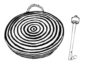 大金铜制,外形似锅,锣面平坦无脐,近边部呈坡形,锣边较宽,并向背面收束。锣面直径35厘米、锣边宽8.5厘米、背口直径30厘米,锣边一侧钻孔系绳。