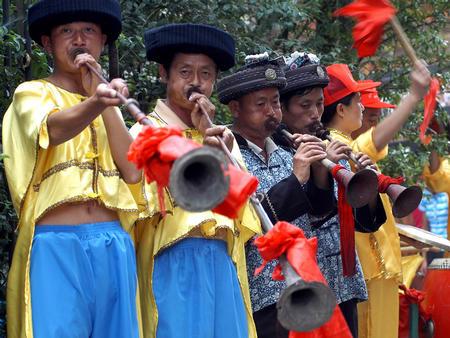 仡佬族古代的乐器主要是铜鼓。《唐书》载,仡佬人“燕聚则击铜鼓,吹大角,歌舞为乐”。铜鼓在仡佬族历史上,既是礼器,又是乐器,曾非常流行,后因社会剧烈动荡变迁,铜鼓日渐失传,仅有一些有关铜鼓的残俗及传说留存民间。如清末民国初,安顺县湾子寨的老人在弥留之际,家人要将老人扶坐在铜鼓上落气后方行沐浴。平坝大狗场老人咽气时,除扶其坐在铜鼓上,还要用两面铜鼓垫脚。