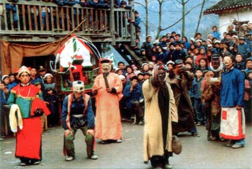 傩戏头戴脸壳,脸壳只有一个固定的形象,或凶狠或慈祥,一成不变。演出时,动作简单、古老而粗旷。唱腔的旋律起伏不大,似唱又似念。
