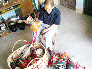 6月4日,环江毛南族自治县下南乡堂八村70岁的毛南族傩师谭信慈,在老伴的协助下,把两个沉重的箩筐拖下楼来。