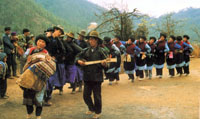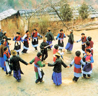 队形,主要有(手牵手的)单圆圈、双圆圈及半圆圈,一般习惯逆时针方向跳,也可顺时针方向跳。若围成双圆圈时,同方向和不同方向跳均可。舞时不受时间、地点和人数的限制,参加跳舞的人可随时介入,也可先后起步,也可部分人舞,另一部分人边走边唱(民歌)。待唱完后,又随之起舞。