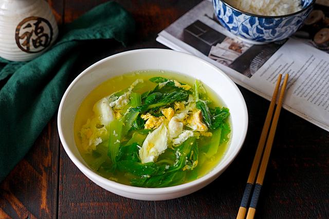 做法:将小白菜淘洗干净,锅中加入2碗热开水,煮开后再放入小白菜,磕入鸡蛋,放入少许盐煮开即可关火。