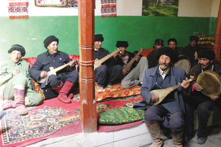 歌手们都是60岁以上的老人,但当他们唱起古老的塔吉克民歌时,个个都是那样深情,仿佛忘记了自己的年龄。只要鹰笛、手鼓、热瓦甫等乐器一响,歌声就随之而起,老人们唱到激动时就站起来手舞足蹈,那些古老的民歌好像又把我们带到了那古老的年代。
