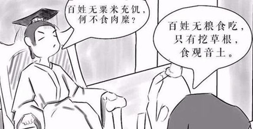 又有一年闹灾荒,老百姓没饭吃,到处都有饿死的人。有人把情况报告给司马衷,但司马衷却对报告人说:“没有饭吃,他们为什么不吃肉粥呢?”报告的人听了,哭笑不得,灾民们连饭都吃不上,哪里来肉粥呢?由此可见司马衷是如何的愚蠢糊涂。