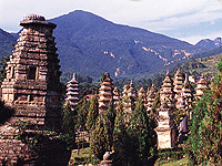 少林寺塔林位于少林寺以西约300米处,是少林寺历代高僧的墓地。塔林总面积约2.1万多平方米,是中国现存数量最多的墓塔群,共计存有唐贞元七年(公元791年)至清嘉庆八年(公元1803年)之间的历代砖石墓塔243座。其中包括唐塔2座、宋塔3座、金塔6座、元塔40座、明塔138座、清塔10座。塔一般为1~7级,最高的可达15米,造型有四角、六角、柱体、锥体、直线形、抛物线形、瓶形、圆形及独石雕刻等。塔的规模是根据僧人生前在佛教中的地位、修养及威望决定的。每座塔前均有塔额,有的还有塔铭,详细记载着死者的生平事迹和选塔人的姓名。少林寺塔林是研究中国历代宗教史、砖石建筑史和雕刻艺术史的宝库。(国家文物局)