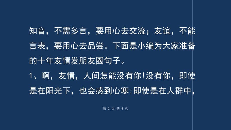 时光在走,我们在变,很多人走着走着就不见了,所以说一段友谊,要维持不容易,维持十年更是难!这样的友谊真好,让人羡慕!下面是关于致十年友谊的句子,看看有没有哪一句是你喜欢的吧! 1。